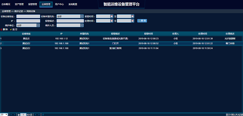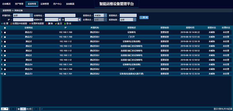 3.5 报警管理模块:显示所有设备故障信息,包括故障内容,报障日期,处理状态。基于前端不同硬件设备,告警内容包含:电口失去连接告警,市电欠压/高压告警,漏电告警,设备掉电告警,市电掉电告警,断网(断纤)告警,相机死机告警,相机掉电告警,门打开告警,水浸告警,补光灯异常告警等;支持邮件或手机APP派单