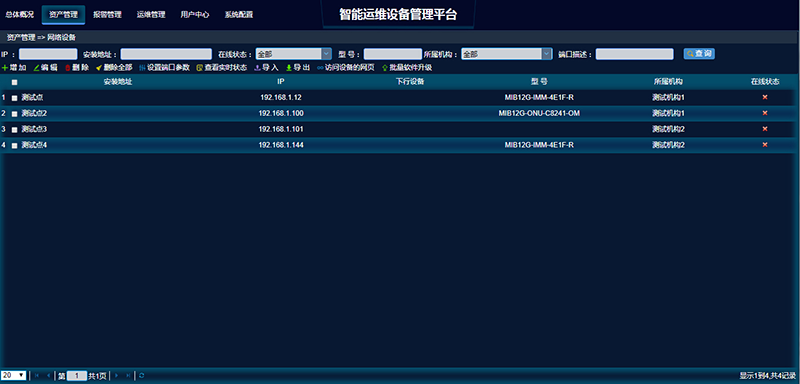3.3 资产管理模块:列表形式展现所有被管理设备信息,在线状态、支持设备信息查询、导出,批量添加、升级设备
